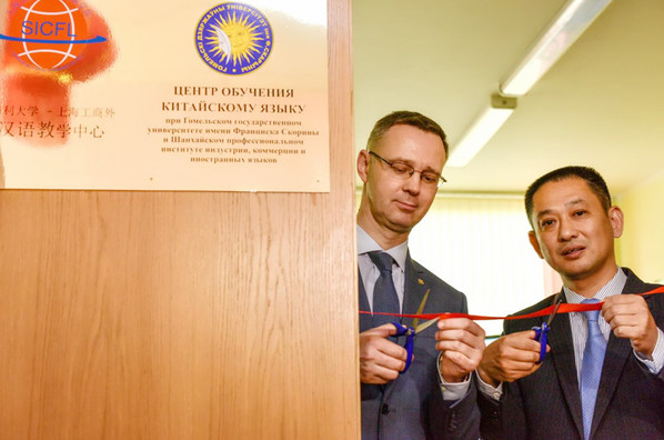当地时间2018年6月8日下午4点,戈梅利大学-上海工商外汉语教学中心在白俄罗斯戈梅利国立大学挂牌成立。戈梅利国立大学哈霍莫夫校长、学校相关部门及院系负责人参加挂牌仪式,上海工商外国语职业学院段仁启副校长、欧洲语言文化学院王保士副院长作为上海工商外国语职业学院代表受邀出席挂牌仪式。段仁启副校长和哈霍莫夫校长一起为中心成立剪彩并揭牌。戈梅利大学孔子学院的领导和师生、参加汉语学习的当地中小学生代表、戈梅利大学语言系的师生及社会代表近五十人参加了中心的成立及挂牌仪式。当地电视台及多家媒体参加并报道了中心成立仪式。