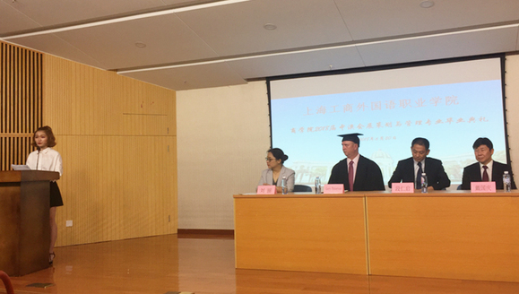 随后,商学院院长刘丽宣读了2105级优秀毕业生评选决定,并由段仁启副校长和戴国庆处长为上海市优秀毕业生刘晓慧和校优秀毕业生冯佳音颁奖。刘晓慧作为学生代表发言。会展专业辅导员张晓昕老师、墨尔本理工学院酒店管理学院院长Gary Paterson和副校长段仁启也先后致辞,表达了对学生们的真挚祝福和美好期许。