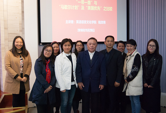 11月29日下午,英语语言文化学院院长陆效用教授在四号楼四楼报告厅为英语语言文化学院、新媒体与文法学院大一学生代表,讲授 “中国系列”思政选修课程《开放中国》第六课:《“一带一路”与 “马歇尔计划”及“美国优先”之比较》。学校党委副书记、副校长段仁启,思政教学部主任沈李,英语语言文化学院副院长李爱群及英语语言文化学院部分教师到场聆听。讲座由沈李主任主持。