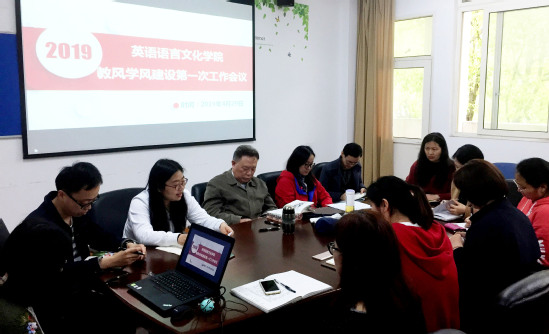 为了响应学校推行的二级学院目标管理责任制,落实立德树人的根本任务,把思想政治工作贯彻教育教学全过程,英语语言文化学院积极推进教风学风建设活动,成立学院教风学风工作小组,组长由陆效用院长领衔,副组长由申洪波副院长担任,组员由孙辉、夏洋洋、窦春霞、严华、吕旻、花莹、王欢、尹玉乾、冉蓉等教研室负责人及年级负责人组成,每学期定期开展教风学风工作研讨,就教学过程中存在的一些实际问题商讨解决方案,为师生营造良好的教和学的氛围,形成长效机制,为推动学校办特办强做出贡献。