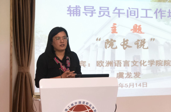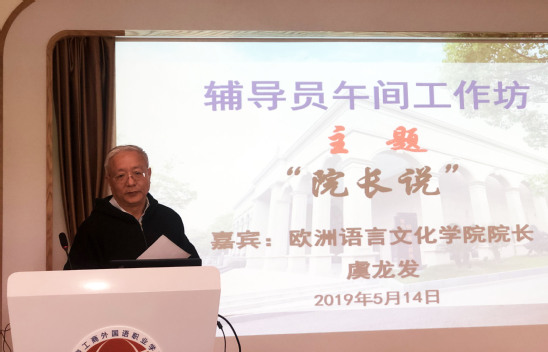 5月14日中午,由学生处主办的第九期辅导员“午间工作坊”之“院长说”(第四期)活动在大学生活动中心辅导员工作坊举行,此次活动邀请欧洲语言文化学院院长虞龙发教授作为主讲嘉宾。校党委副书记、副校长段仁启,学生处处长陈瑜,各二级学院学生工作负责人及全体辅导员出席了此次活动,活动由陈瑜主持。