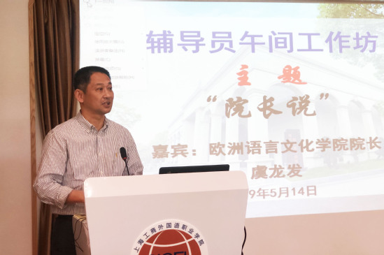 514日中午,由学生处主办的第九期辅导员“午间工作坊”之“院长说”(第四期)活动在大学生活动中心辅导员工作坊举行,此次活动邀请欧洲语言文化学院院长虞龙发教授作为主讲嘉宾。校党委副书记、副校长段仁启学生处处长陈瑜,各二级学院学生工作负责人及全体辅导员出席了此次活动,活动由陈瑜主持。