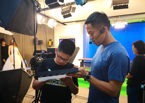 新闻摄影摄像体验项目由专业教师带领学生一起揭开电视新闻栏目的摄录和制作的神秘面纱,让学生感受电视新闻节目拍摄和导播过程。体验的学生们亲自动手完成简单的电视新闻播报、拍摄、导播等。坐在绿幕前,灯光之下的学生俨然一个个新闻主播。