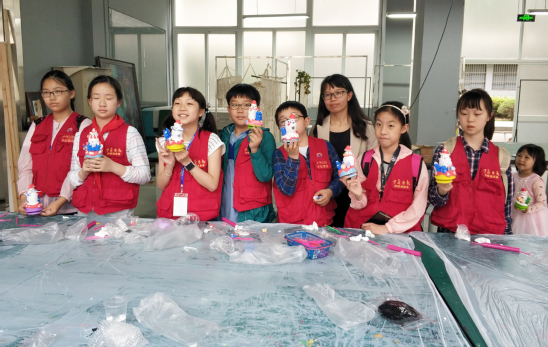 创意黏土装饰画和微景观花园创意制作两个项目,重在对学生进行美感教育,培养学生的动手能力。前者选取超轻环保粘土材料,通过教师讲解步骤,体验者构思形象,动手制作构件,搭配色彩,完成创作。在前来体验的小孩子们精心塑造下,一个个可爱的玩偶呈现出来,尽管有的比例不太协调,颜色层次不够分明,甚至有的具体面目也不清晰,但这依然不影响孩子们的参与的积极性。