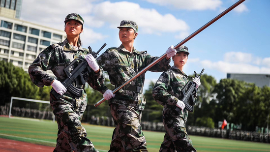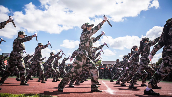 由学生组成的女子匕首操、男子擒敌拳方阵依次进行汇演。