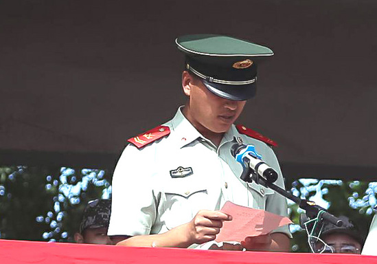 军训团郭伟团长宣读优秀连队表彰名单,各职能处室领导为优秀连队颁发锦旗。