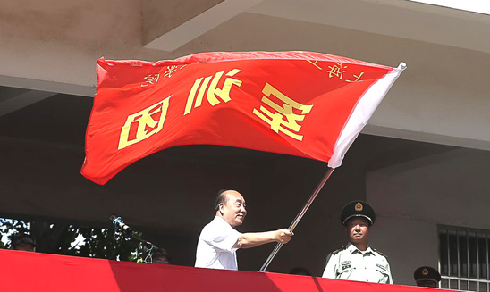 常务副校长毛忠明向军训团团长郭伟赠送感谢锦旗。