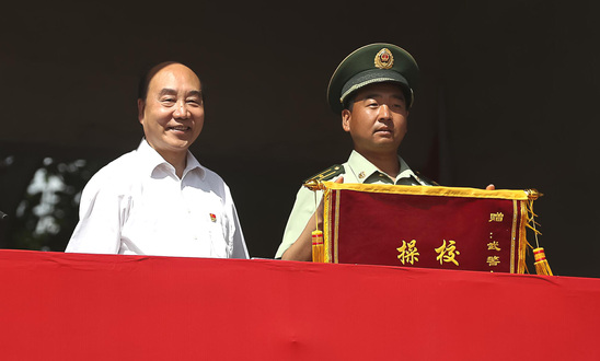 校党委书记李月松在军训团团长郭伟同志陪同下,检阅全体受训连队。