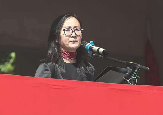 英语语言文化学院副院长李爱群副教授代表教师发言。作为一名从教十五年的中青年教师,她从“如何才能活得上进,活得有担当,如何让大学生活过得有意义”这个话题,引出她送给2019级同学的五个关键词:信仰、自律、学习、主动和沟通。她希望同学们能够坚定信仰,坚持自律,认真学习,主动参与,积极沟通,在工商外的舞台上大放光彩。