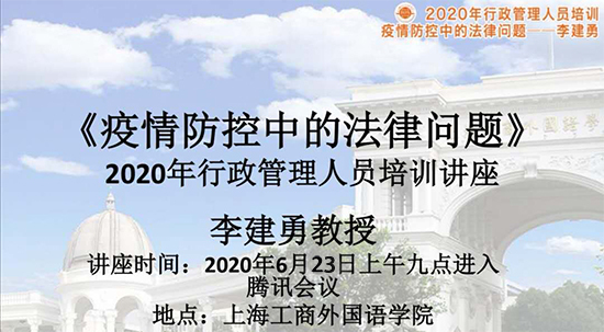6月23日,学校2020年度行政管理人员系列培训开展最后一讲,全体行政管理人员在线聆听并学习了新媒体与文法学院李建勇教授关于《疫情防控中的法律问题》的专题讲座。