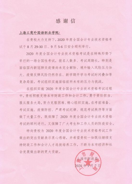 近日,我校收到上海市财政局同志送来的一封感谢信,对我校在2020年度会计专业技术资格考试中的工作表示肯定和感谢。