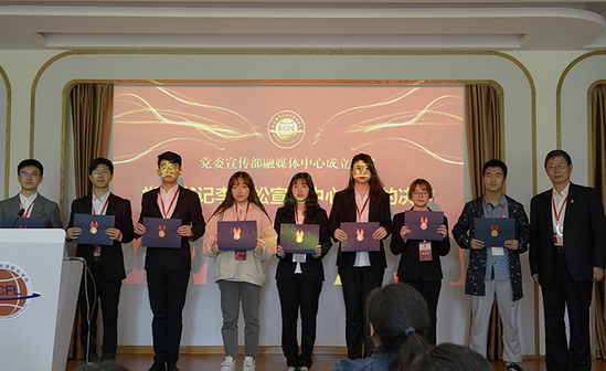 党委书记李月松宣读中心成立的决定及第一届学生成员名单并做了讲话,李书记指出,成立党委宣传部融媒体中心,是新时代高校宣传工作的需要,希望中心成员牢牢坚持正确的舆论导向,紧紧把握宣传工作的主旋律,以强烈的责任感、使命感,积极创新、大胆探索,加快推进学校融媒体建设,切实发挥融媒体中心的舆论导向作用。同时,鼓励中心成员要加强业务学习,在参与各类活动过程中不断提高专业技能、掌握媒体技术,在中心这个平台中努力创新,施展才华,争做优秀的校园融媒体人,为学校开创宣传思想工作新局面做出积极贡献。
