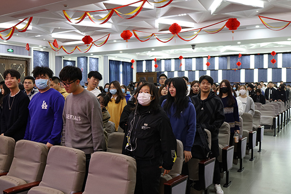 王正明教授通过列举集、艺、兴、扶、拯、酬、祝、监、贪、坠、囚、和、众、梦14个甲骨文的故事,并将14个字所体现出的深刻内涵串联起来,既展现出我国先人创字的伟大智慧,又将所蕴含的哲理有力传承,给同学们讲述了很多做人的道理。王教授还通过问答和互动的方式,使得同学们学习热情高涨,整场报告气氛热烈。最后,全体师生起立同王正明教授共同朗诵南宋朱熹的《观书有感》一诗,加深学习体验,加强学习效果。