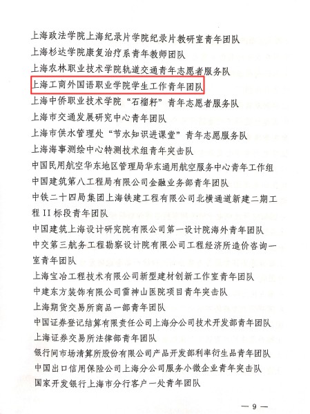 经基层推荐、层层选拔,共青团上海市委员会于11月2日公布了“上海市青年五四奖章”集体、“上海市青年五四奖章”个人(含标兵)的表彰名单。我校“上海工商外国语职业学院学生工作青年团队”荣获“上海市青年五四奖章”集体荣誉称号。