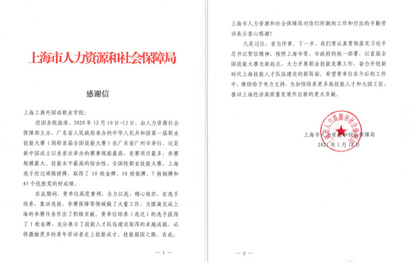 我校新媒体与文法学院收到了一封来自上海市人力资源和社会保障局发来的感谢信,感谢我校对首届全国技能大赛各项工作的大力支持并为圆满完成上海的参赛任务作出了积极贡献。