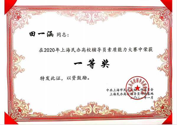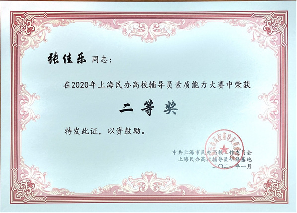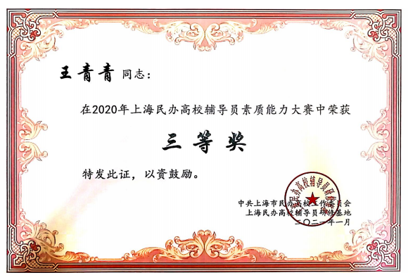 2021年4月14日,2020年上海民办高校辅导员素质能力大赛颁奖仪式在上海建桥学院举行,上海市教委德育处副处长杨长亮为获奖的辅导员老师们颁发了荣誉证书。