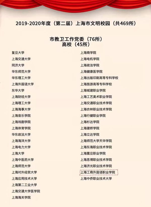 近日,市文明办公布了2019-2020年度(第二届)上海市文明校园名单。经过全校师生的共同努力,我校成功获评2019-2020年度上海市文明校园称号!