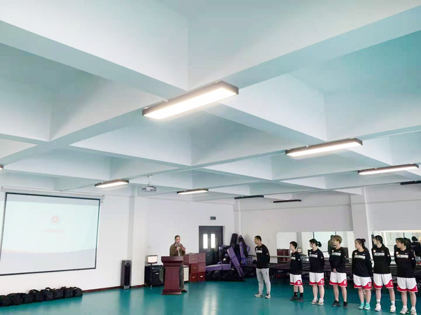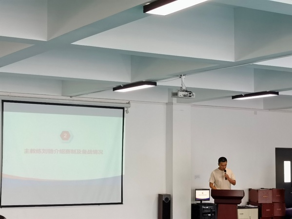 校女子篮球队主教练刘驰进行发言,他从校篮球队运动员组成、备战训练情况等方面进行了介绍,他表示,在全国赛中一定会带领球队赛出风格、赛出水平、赛出工商外精神、赛出好成绩,展示出工商外学子的风采。