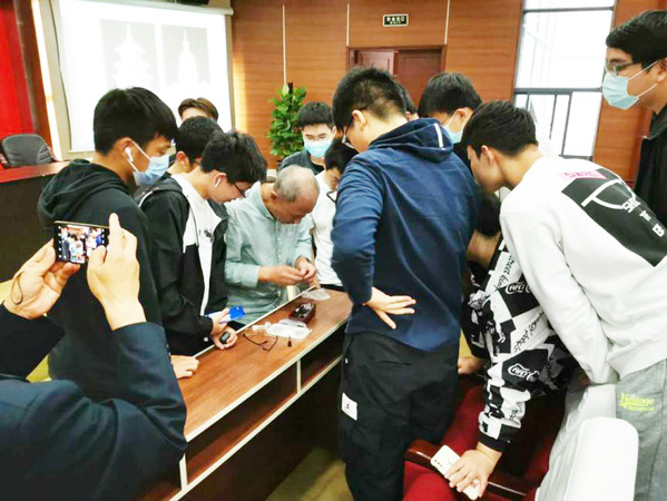随后,王震华老师就自己多年的工匠经验和体会与在场的师生们分享交流。他的演讲热情洋溢,充满了对于榫卯结构和技术的深厚情怀,这让在场的每一位师生都深受感动和鼓舞,尤其谈到中国独有的榫卯结构和技术时,他充满了自豪感并表示要努力传承好这项中国传统的技能。讲座现场,王震华老师还向大家展示了榫卯微缩模型,让同学们走到前台一起观察、动手组装,鼓励同学们探索发问、互动交流,这让很多同学产生了浓厚的兴趣,同学们高度的热情与探索求知的欲望将王震华老师紧紧围绕,渴望多与老师提问探讨,交流学习。