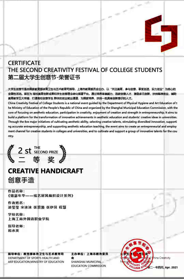 近日,由教育部体育卫生与艺术教育司指导,中国大学生创意节组委会主办,上海市教育委员会承办的第二届中国大学生创意节落下帷幕。经过紧张激烈的专家评审、视频展演、线上答辩等环节,创意设计学院线艺绘'尚品原创工作室凌莹莹、宋冰冰、张碧漪等五位学徒完成的工艺作品《锦瑟年华》在总决赛中荣获二等奖。