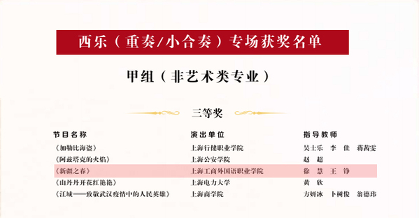 近日,由教育部主办的全国第六届大学生艺术展演活动评选结果揭晓,我校共斩获3项大奖,其中《我的祖先叫炎黄》荣获朗诵专场非艺术类甲组二等奖,《我爱你中国》《梨花又开放》荣获声乐(合唱)专场非艺术类甲组三等奖,《新疆之春》荣获西乐(重奏/小合奏)专场非艺术类甲组三等奖。