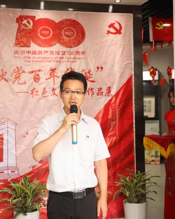 校党委书记李月松发表致辞并宣布开幕。他对红色文化设计主题作品展表示肯定,他指出,“七·一”即将来临,在各级单位热烈庆祝中国共产党建党100周年的重要时刻里,创意设计学院举行红色文化主题作品展,既恰逢其时,又运用了专业优势,将专业知识活学活用、开拓创新,师生们通过学院搭建的平台展示阶段性的学习成果,又将专业与庆祝建党100周年主题、党史学习教育相融合,既突出专业性,又结合时代主题,希望大家继续将这份爱党爱国之情和勤奋钻研的精神发扬并保持,创造更多新的奇迹。预祝活动圆满成功。