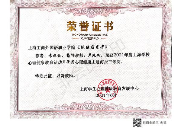 近日,由上海学生心理健康教育发展中心举办的2021年度上海学校心理健康活动月优秀心理健康主题海报设计大赛评选结果出炉,我校学生袁欣怡的参选作品《孤独症患者》荣获三等奖。
