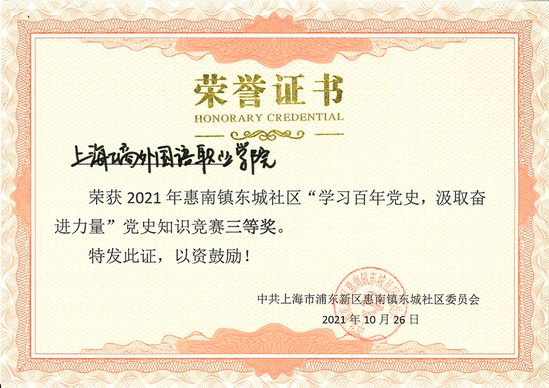 本次党史知识竞赛是由惠南镇东城社区党委、各党建联建单位、惠南镇东城社区综合党支部联合开展。通过线上预赛答题,共有10支队伍进入决赛,决赛分为必答、抢答和风险抢答三大环节。新媒体与文法学院王丽媛、顾莹雯、金怡菲同学在决赛中踊跃答题、勇闯难关,终获比赛三等奖。