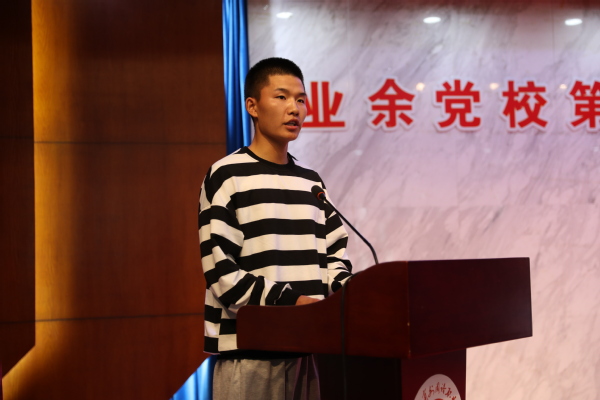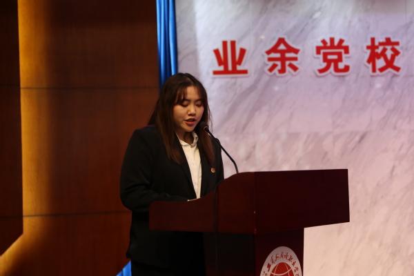 商学院国商2003班学生詹佳妮作为优秀学员代表进行发言。她分享了自己在业余党校的学习心得及收获,鼓励新学员珍惜党校学习机会,严格自律,不断加深对党的理论知识的学习,坚定政治立场,提高政治理论水平,加强党性修养,树立远大志向。同时,要把握党史学习教育的契机,认真学习党的光辉历史,用党的奋斗历程和优良作风坚定信念、砥砺品格,践行使命。