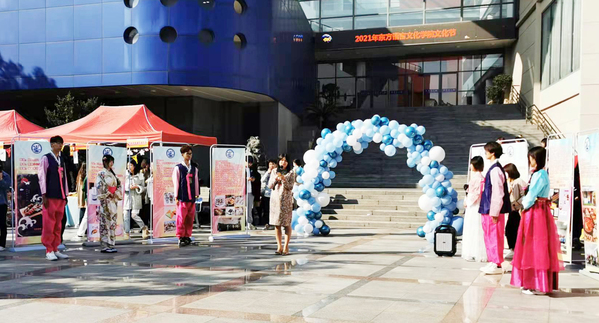 11月15日,东方语言文化学院在图书馆广场举办了第二届“璀璨文化月,东语嘉年华”校园文化节活动。该文化节是东方语言文化学院传统特色文化活动,以学院学生为主,邀请全校师生共同参与,展示日韩专业学生风采、昂扬的精神风貌。活动还特别邀请了上海市浦东外事服务学校、上海市经济管理学校、上海市商业学校三所中高职贯通学校的师生共同参与。