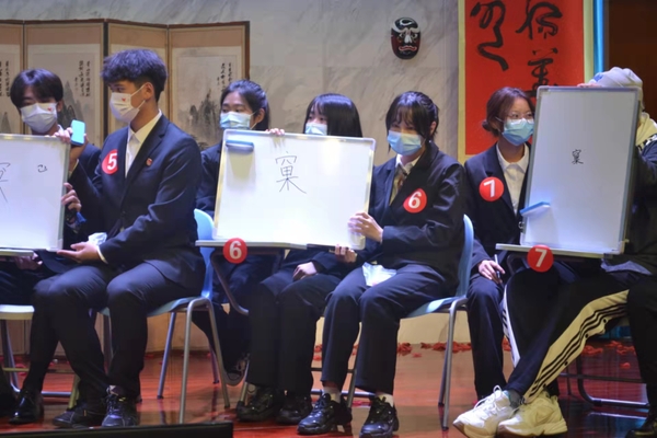 此次大赛共设四个环节,分别是“忆江南”—笔试题、“浪淘沙”—必答题、“飞花令”—情景题、“定风波”—趣味题。赛前每支参赛队伍还各抽取了一个锦囊,可以自行决定使用的时机,大大增加了比赛的趣味性。比赛过程中,八支入围的参赛队伍准备充分,全力以赴,在笔试题和必答题环节,几乎所有选手都能正确答出“文学常识”、“历史知识”、“经典国学”等模块内容,展现出深厚的文化功底。在情景题环节,可谓是高手对决,紧张又刺激,既是对选手诗词储备量、临场反应能力的考验,也是对选手心理素质的考验,现场气氛热烈,掌声不断。在趣味题环节,队伍之间两两配合,在竞争与合作中感受中华传统文化“大同”的思想,同时也将比赛气氛推向高潮。