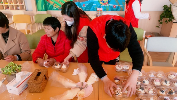 在制作蛋糕过程中,有的老人不会使用裱花袋,同学就耐心、热情地手把手给老人做示范,并鼓励老人;有的老人制作得又好又快,就把多余的蛋糕胚发给其他人,相互帮助、相互交流。制作结束后,同学们帮助老人分发包装盒并协助装盒,老人们看到自己亲手制作的成品,心里别提有多开心了,同学们也与各位老人共同分享这份喜悦。