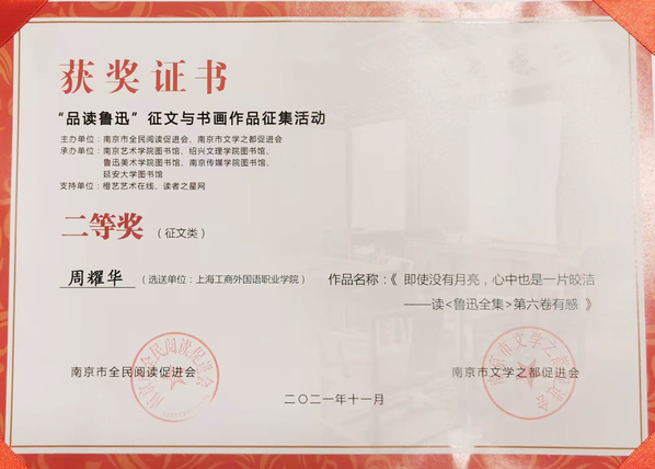 今年是鲁迅先生诞辰140周年,为纪念鲁迅先生为文艺事业作出的杰出贡献,弘扬中华优秀传统文化,南京市全民阅读促进会和南京市文学之都促进会向全国开展了“‘品读鲁迅’征文与书画作品征集活动”。该征集活动从4月12日始至9月15日结束,经专家教授的初评和终评,近日传来喜讯,我校图书馆周耀华同志提交的《即使没有月亮,心中也是一片皎洁——读<鲁迅全集>第六卷有感》在本次征集活动中荣获征文类“二等奖”。