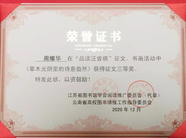 2020年,周耀华同志又参加了由江苏省图书馆学会阅读推广委员会、云南省高校图书情报工作指导委员会、南京艺术学院图书馆、南京图书馆、南京邮电大学图书馆、扬州图书馆、云南师范大学图书馆和中央戏剧学院图书馆向全国承办的“‘品读汪曾褀’征文与书画作品征集活动”,该活动是为纪念汪曾褀先生为文艺事业做出的贡献、弘扬中华优秀传统文化。征集活动从2020年4月23日始至2020年9月28日结束,同年年底也传来喜讯,周耀华同志提交的《草木光阴里的诗意盎然》在这次征集活动中荣获征文类“三等奖”。