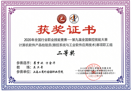 2020年全国行业职业技能大赛第九届全国数控技能大赛于2021年5月18日至5月24日在江苏省无锡市无锡技师学院举行。我校智能制造与信息工程学院以吴卫奇高级技师为教练、方金华高级技师、瞿梦欢老师为参赛选手组队参赛,在上海数控行业竞争中与宝钢、上海航天、上海电子信息职业技术学院等七支队伍一同脱颖而出,获得全国参赛资格。近日获悉,我校参赛队在“数控技能—计算机软件产品检验员” 赛项的角逐中崭露头角,荣获二等奖,为学校争得荣誉。