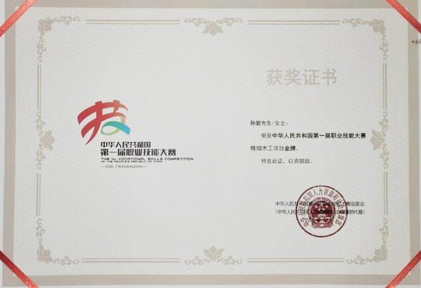 在获此荣誉称号之前,孙岩同学曾获第八届星光计划技能大赛精细木工项目一等奖,第一届长三角木艺技能大赛第一名,轻工业联合会精细木工项目全国选拔赛第一名,首届全国技能大赛精细木工项目金牌。