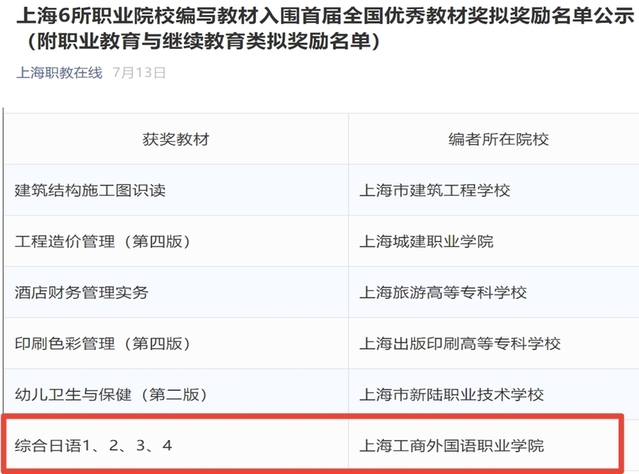 此次全国教材建设奖是根据《国家教材委员会关于开展首届全国教材建设奖评选工作的通知》(国教材〔2020〕4号)要求,经过组织申报、初评推荐和国家评审等程序,在首届全国优秀教材“职业教育与继续教育”类 400种中评选而出。上海共有6所职业院校编写教材入围该奖项。