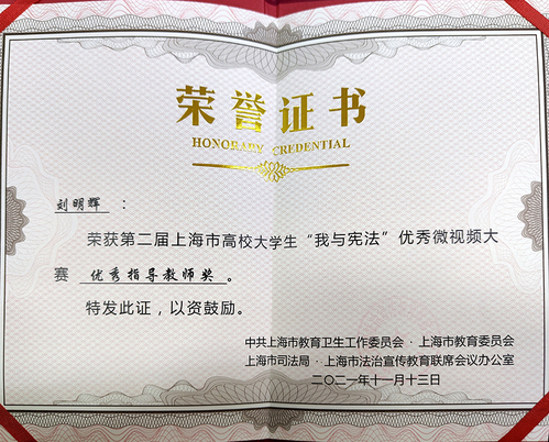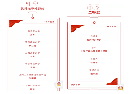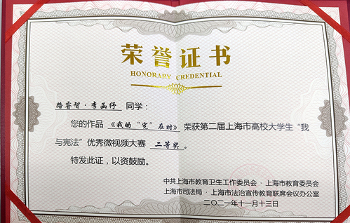 近日,由中共上海市教育卫生工作委员会、上海市教育委员会、上海市司法局、上海市法治宣传教育联席会议办公室主办,华东政法大学传播学院承办的2021年上海市高校大学生“我与宪法”优秀微视频征集大赛公布获奖名单。由我校向组委会推荐的新媒体与文法学院学生路睿智、李函纾的作品《我的“宪”在时》荣获二等奖,新媒体与文法学院法律事务专业教师刘明辉荣获“优秀指导教师奖”。