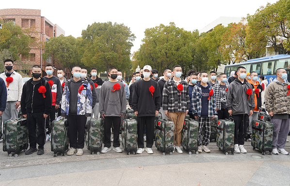 随后,与会领导及辅导员为新兵佩戴光荣入伍红花,并送上祝福。新兵们与到场送别的亲朋好友、辅导员老师进行了短暂告别后,恋恋不舍地登上了前往役前训练基地的大巴。