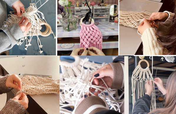 在疫情防控特殊时期,禾风织造工作室采取“线上”体验活动形式进行开展:工作室设计首席和水英老师带领学徒通过“教程录制”形式,借助小红书平台进行发布与推广,选择体验的师生在领取材料包后自由选择时间与地点进行手作体验,并定时通过微信平台与老师进行沟通与技术交流。师生们热情高涨,一周后积极“秀”出自己的学习成果。