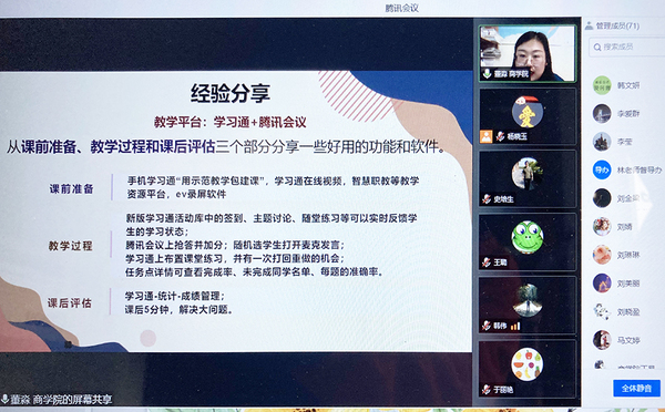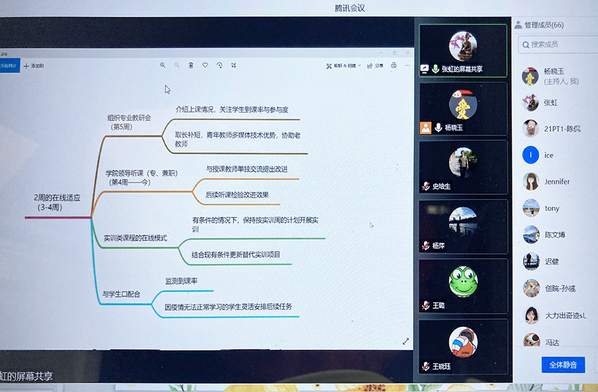 会议分两个阶段,一是总结和布置。总结即由各学院(部)分管教学副院长(主任)逐一对本学院(部)的前阶段线上教学情况做总结汇报,大家通过课件、文字提纲、树状图等多种方式做汇报,既讲到了师生的共性问题,又提出了一些个性情况,同时还针对发现的问题提出了具有建设性、创新性的解决办法。