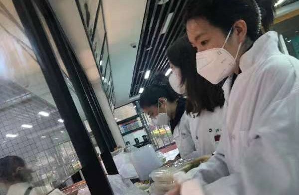 (英语语言文化学院教师学员黄蕾在课余时间赴食堂给师生打包饭菜)
