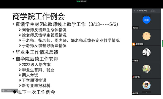 通过本次腾讯会议,全体教师全面了解和认识了商学院近期教学基本情况和学生管理情况,并对后期工作有了更清晰的方向。