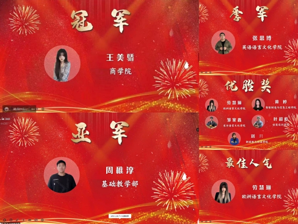 经过激烈比拼和现场评分,最后来自商学院的王美骄夺得桂冠,基础教学部周稚淳获得亚军,英语语言文化学院张思博获得季军,东方语言文风文学院邹家鑫、欧洲语言文化学院劳慧琳、新媒体与文法学院刘玥、智能制造与信息工程学院黄婷和创意设计学院叶超屹获得优胜奖,欧洲语言文化学院劳慧琳获得最佳人气奖。