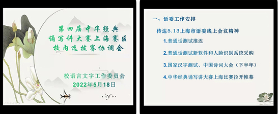 5月18日,根据上海市教委决定举办第四届中华经典诵写讲大赛上海赛区系列比赛要求,校语言文字工作委员会召开诵写讲比赛校内选拔赛工作线上协调会,教务处、新媒体与文法学院、创意设计学院、校团委、基础教学部、工会等部门负责人参加本次会议。