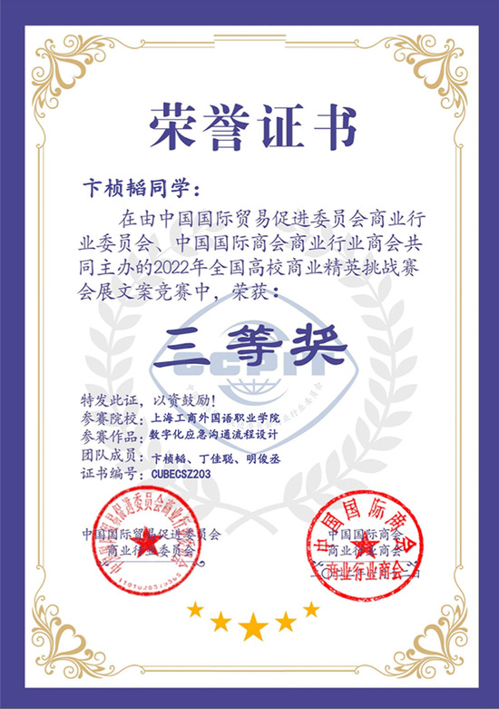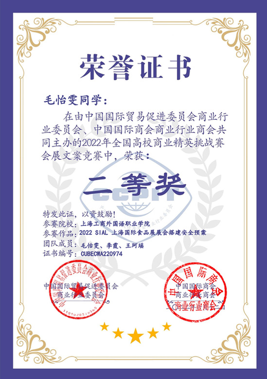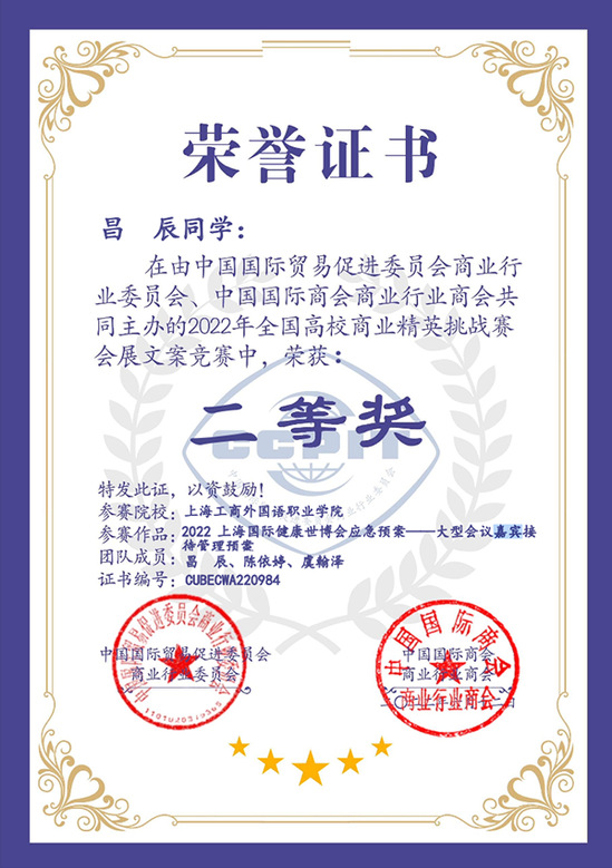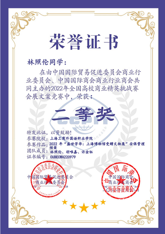 同时,会展文案(应急预案)写作竞赛也取得了不错的名次,均获全国二等奖,分别是昌辰、陈依婷、虞翰泽小组所撰写的《2022上海国际健康世博会应急预案——大型会议嘉宾接待管理预案》,毛怡雯、李霞、王珂瑶小组撰写的《2022 SIAL上海国际食品展——展会搭建安全预案》,以及林照伦、胡唯嘉、许金钰小组撰写的《2022盛世芳华上海博物馆受赠文物展——安保管理预案》。
