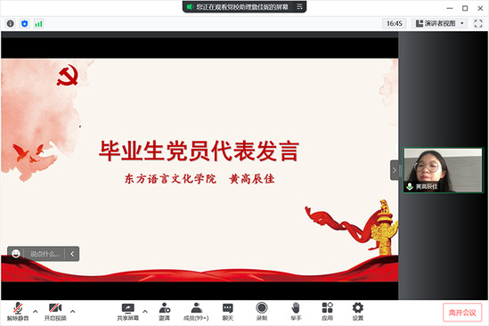 东方语言文化学院韩语1903班黄高辰佳同学作为毕业生党员代表发言。她回顾了在工商外三年学习生活取得的进步,重点讲述了自己在向党组织靠拢过程中的思想变化,同时也详细阐明了作为一名大学生党员毕业后的努力方向。最后,她对党组织、母校、老师的培育之情表达了衷心感谢。