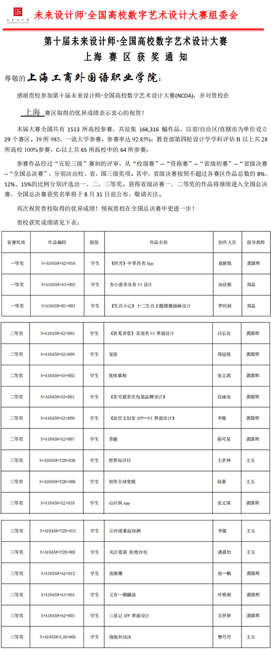 近日,2022第十届未来设计师·全国高校数字艺术设计大赛(未来设计师NCDA大赛)省级赛和全国总决赛获奖名单揭晓,我校创意设计学院学子在激烈的比赛竞争中,斩获全国一等奖1项、二等奖1项、三等奖1项;荣获省级一等奖3项、二等奖6项、三等奖9项,优异成绩的取得展现了学院以赛促教、以赛促学的突出成效。