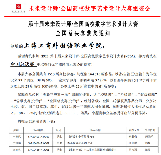龚国辉老师指导学生袁新悦创作的《<药芳>中草药类APP》获国赛一等奖;郑磊老师指导学生汤佳妮创作的《杏小虎养生茶VI设计》获国赛二等奖,指导学生罗向颖创作的《<生肖小记>十二生肖主题国潮插画设计》获国赛三等奖。