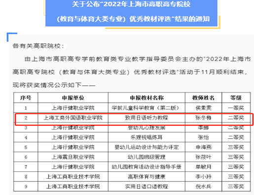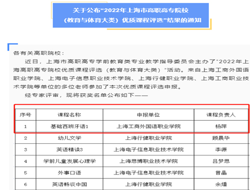 近日,由上海市高职高专学前教育类专业教学指导委员会主办的“2022年上海高职高专院校优秀教材评选和优质课程评选(教育与体育大类)”活动结果公示,我校荣获“2022年上海市高职高专院校(教育与体育大类专业)优秀教材”二等奖一项、荣获“2022年上海高职高专院校优质课程”一项,分别是张冬梅老师团队的教材《致用日语听力教程》和杨萍老师负责的课程《基础西班牙语1》。